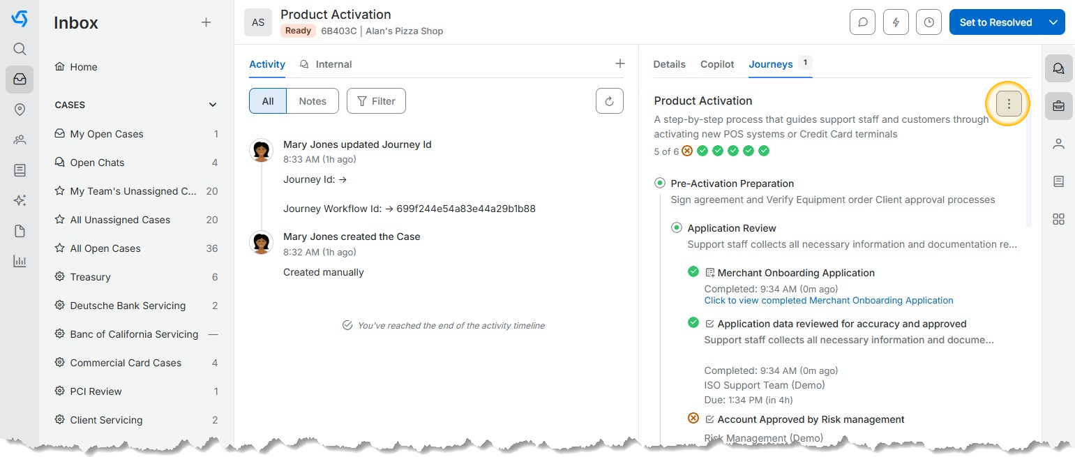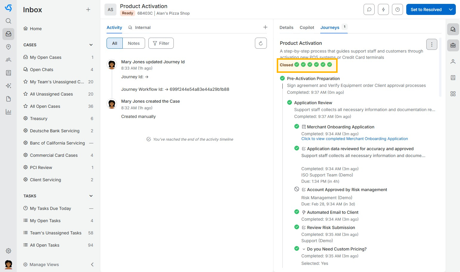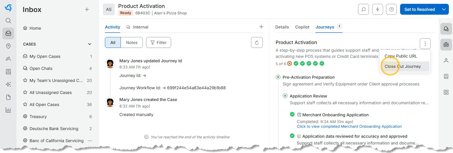 Complete a Journey - App V5 Last Updated: March 3, 2026 What's in this article? Click Journeys from the Case DetailsPerform the steps listedWhen done with a Task, Click the Ellipses menuClick "Complete Action" to mark the Task as completeYou will now be moved to the next TaskYou can also click the "Complete" box under the Task to complete it when availableIf needed you can also skip an task by selecting Skip ActionSome Tasks require that a decision be made, or option selectedUse the drop-down to make a selectionChoosing an option will move the journey to the next TaskClick Apply to complete the TaskWhen all tasks in a Step have been completed, the Step will be marked as CompletedWhen all of the Steps have been completed the Stage will be marked as complete.When all of the Stages are complete and the journey has been finished you will Closeout the Journey by selecting the eleipses menu for the JourneyClick Close Out JourneyThe Journey will now show as closed